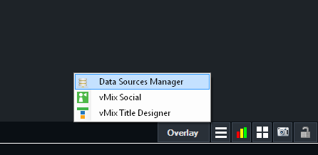 1. Open up the Data Sources Manager from the  menu in the bottom right hand corner of the main vMix window.