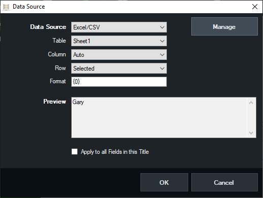 Row: Select the row to use for this particular Title Field. If you leave this set to Selected, the data source will map based on the currently selected row in the Data Sources Manager.