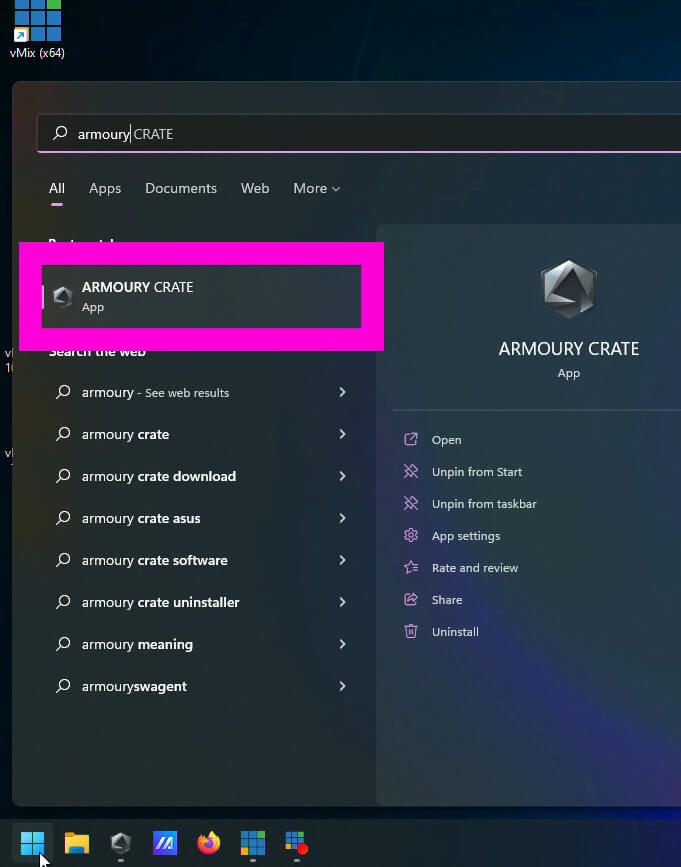 1) Search for the Armoury Crate application on your ASUS Laptop.