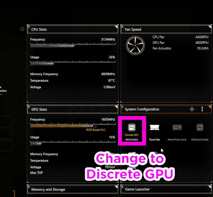 2) Once you have opened Armoury Crate, go to the System Configuration section and click on the Mux Switch. Make sure this has been change the Discrete GPU and then restart your laptop.